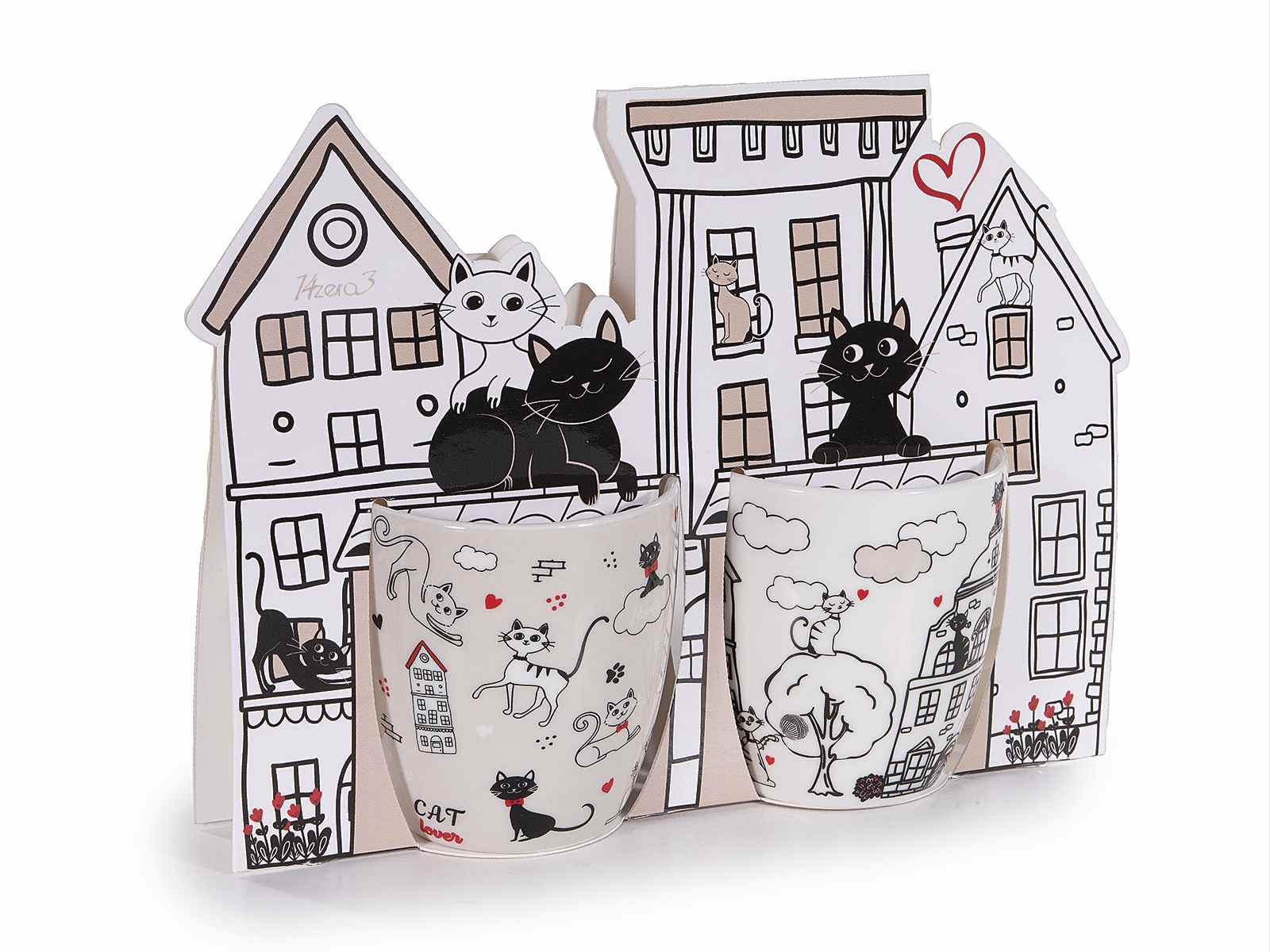 Confezione regalo con 2 tazzine da caffè in porcellana decorata con stampa gatto